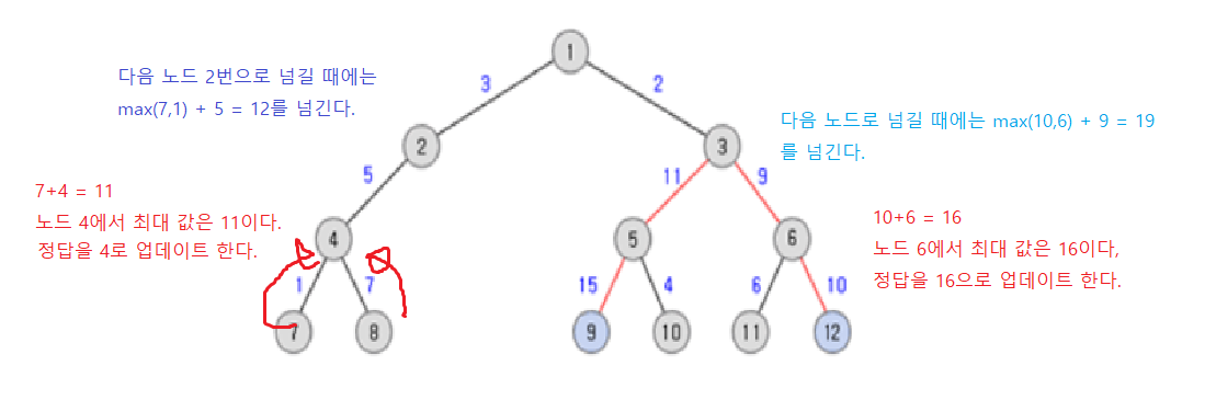 위 사진처럼 자식 노드부터 순차적으로 탐색해 나가면서 부모 노드로 올라갈 때에는 최댓값 2개를 골라 더해준 후 정답 값보다 크면 정답 값을 업데이트해 준다.