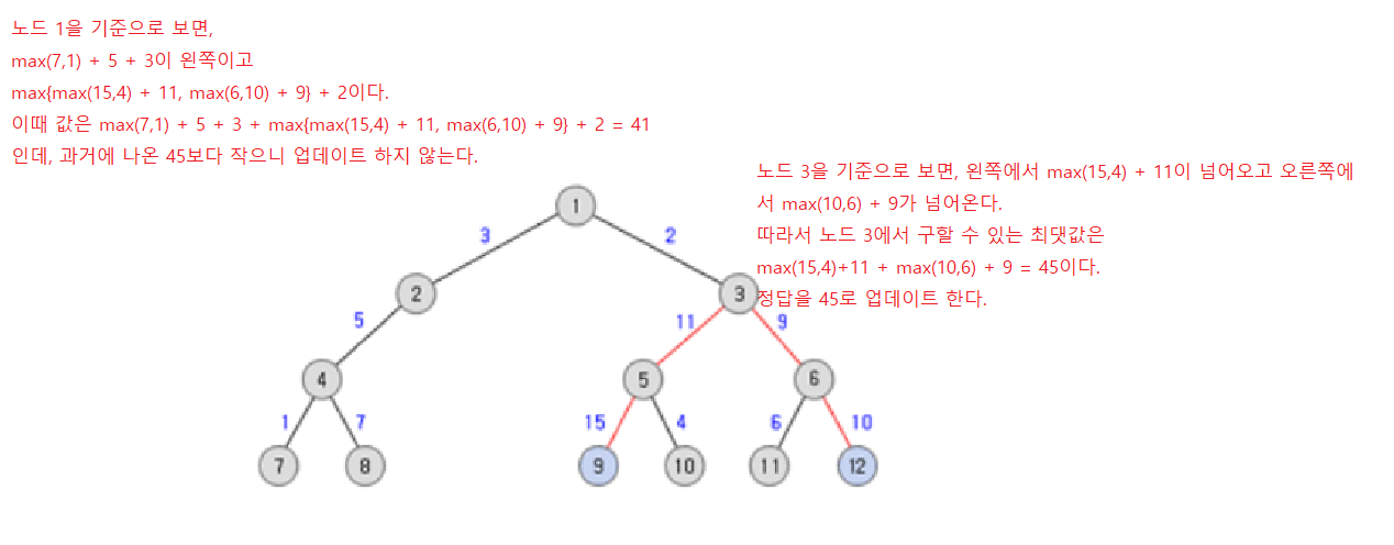 위 사진처럼 자식 노드부터 순차적으로 탐색해 나가면서 부모 노드로 올라갈 때에는 최댓값 2개를 골라 더해준 후 정답 값보다 크면 정답 값을 업데이트해 준다.