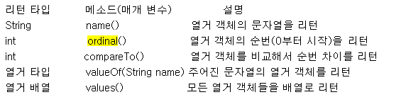 - java enum은 class 개념도 포함한다. -> 추가적인 생성자, 메소드, 필드를 가질 수 있다.