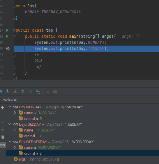 - enum으로 선언된 각각의 필드는 [name, ordinal] 속성을 가지는 것을 확인할 수 있다.