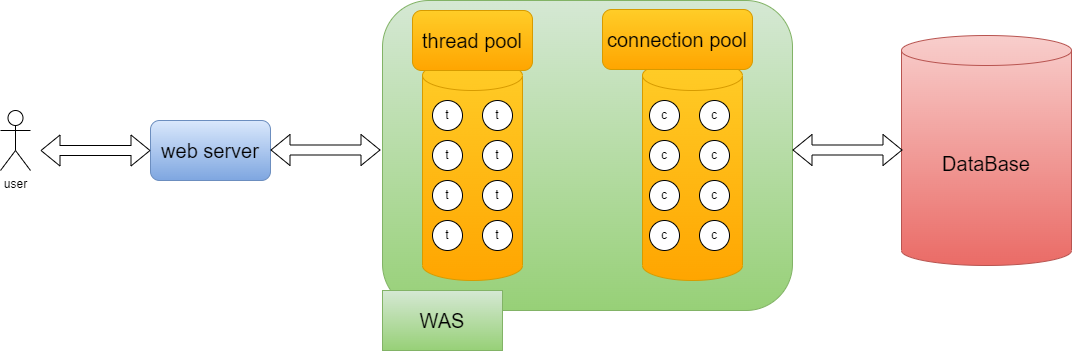 위 그림에서 WAS에 집중해 보겠습니다. WAS가 사용자 요청을 처리하는 방법은 아래와 같습니다.