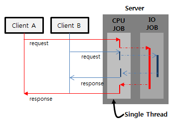 - 각각의 요청은 cpu 작업은 동기적으로 처리되고 io작업은 비동기 처리된다.