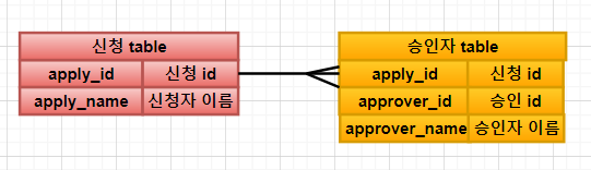 apply_id는 하나의 신청 건에 대한 unique key이고 approver_id는 하나의 승인 정보에 대한 unique key이며, 신청 테이블: 승인 테이블 = 1:N 관계이고 외래 키는 apply_id입니다.