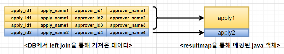 위에서 N+1 select 문제가 발생하는 이유는 처음 조회 쿼리를 통해 가져온 신청자 정보를 기반으로 루프를 돌면서 승인자 테이블에 반복적으로 조회 쿼리를 날리는 데 있었습니다. 이를 해결하기 위해 처음 조회 쿼리를 날릴 때부터 left join을 통해 승인자 테이블의 정보까지 몽땅 가져온 후 nested result 방식을 통해 객체를 메핑 해 주면 될 거라고 생각했습니다.