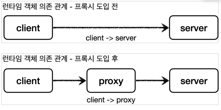 프락시 패턴의 경우 런타임에 client 가 바라보는 구현채는 proxy이고 proxy는 내부적으로 server 객체를 참조하는 형태를 갖습니다.