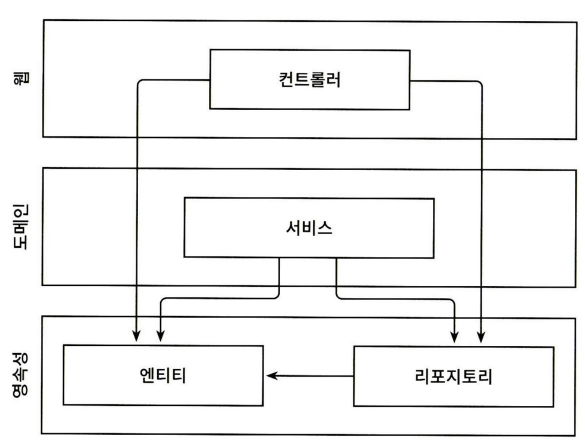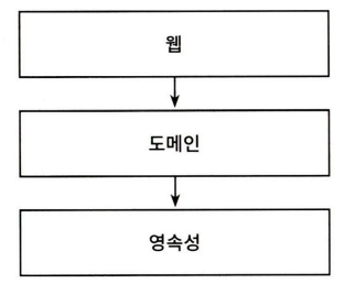 각 계층간 의존 관계는 [웹 -> 도메인 -> 영속성 -> Database]로 흐른다.
