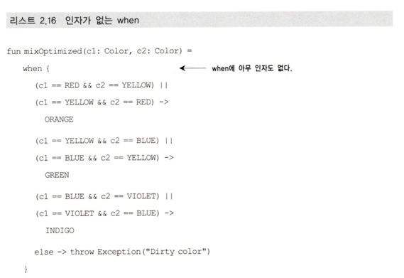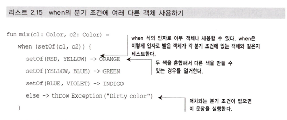 - when 의 분기 조건은 임의의 객체를 허용(java 의 switch 는 분기 조건에 상수만을 사용할 수 있음) -> 코드의 간결성 up