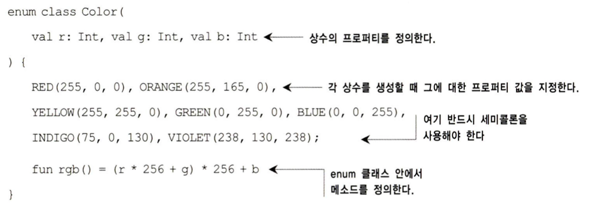 - enum 은 class 앞에 있을 경우 특별한 의미를 지니지만 다른 곳에서는 이름에 사용할 수 있다.(즉, val enum=3 같은 코드가 가능하다)