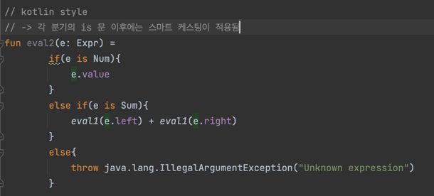 - 일단 is 검사가 성공하고 나면 해당 코드 블락에선 is로 검사한 타입으로 컴파일러에 의해 자동 타입 캐스팅이 되는데, 이걸 스마트 캐스트라고 한다.