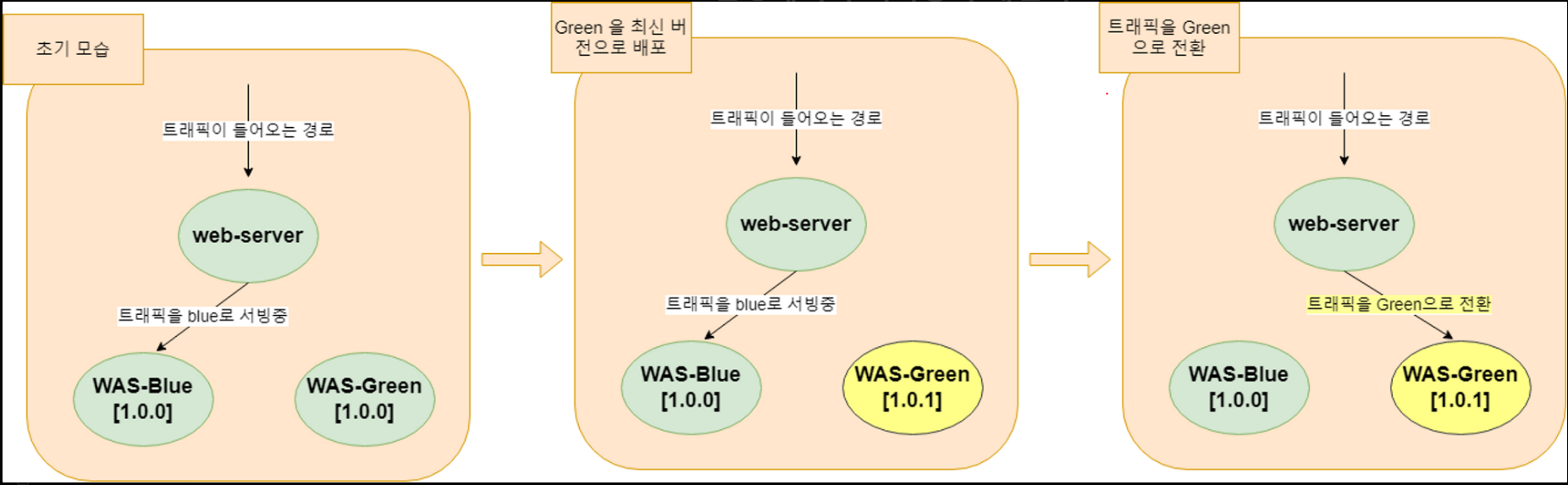 1.0.0 -> 1.0.1로 배포하는 상황에서, 기존에 트래픽이 흘러가던 blue 가 아닌 green 형상을 1.0.1 로 올리고 트래픽을 한 번에 green으로 전환하는 방식으로 배포를 수행한다.